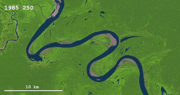 At the extremely bendy point, rivers cut off after the bend point and make a shortcut to become straight again. This phenomenon is known as an oxbow lake, which controls the sinuosity of rivers. This keeps the sinuosity of a river around Pi.
